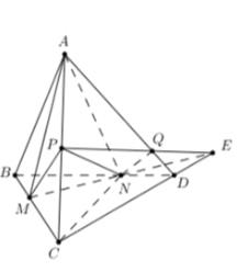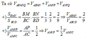 Câu 10. Cho tứ diện ABCD, trên các cạnh BC, BD, AC lần lượt lấy các điểm M, N, P sao cho \(BC = 3BM,BD = \frac{3}{2}BN,\) \(AC = 2AP\). Mặt phẳng \(\left( {MNP} \right)\) chia khối tứ diện ABCD thành hai khối đa diện có thể tích là \({V_1},{V_2}\), trong đó khối đa diện chứa cạnh CD có thể tích là \({V_2}\). Tính tie số \(\frac{{{V_1}}}{{{V_2}}}\).