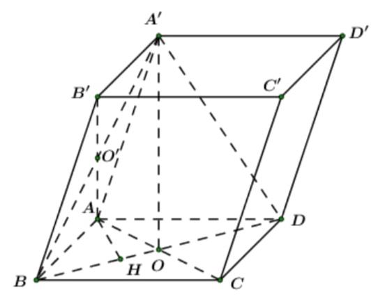 Ta có \(A’O \bot \left( {ABCD} \right) \Rightarrow A’O \bot AH\)