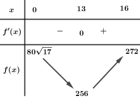 \( \Rightarrow \) Tổng chi phí lắp đặt là : \(f\left( x \right) = 12x + 20\sqrt {{x^2} – 32x + 272} \)