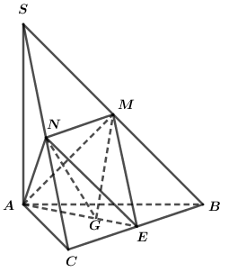 Lại có : \(\frac{{{V_{AMNG}}}}{{{V_{AMNE}}}} = \frac{{AM}}{{AM}}.\frac{{AN}}{{AN}}.\frac{{AG}}{{AE}} = \frac{2}{3}\) \( \Rightarrow {V_{AMNG}} = \frac{2}{3}{V_{AMNE}} = \frac{2}{3}.\frac{{3{a^3}\sqrt 3 }}{{16}} = \frac{{{a^3}\sqrt 3 }}{8}\).