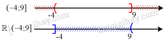 Hiệu của hai tập hợp: \(\mathbb{R}{\rm{\backslash }}( – 4;9] = ( – \infty ; – 4] \cup (9; + \infty )\)
