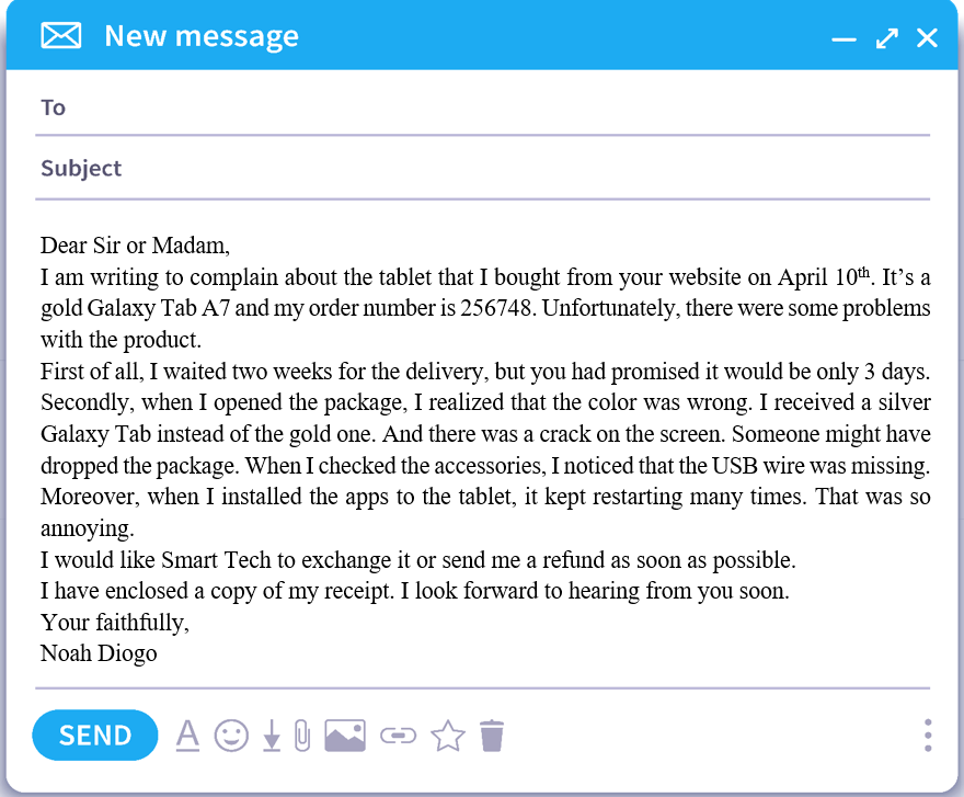 Tôi viết thư này để phàn nàn về chiếc máy tính bảng mà tôi đã mua từ trang web của bạn vào ngày 10 tháng 4. nó là một Galaxy Tab A7 màu vàng và số đơn đặt hàng của tôi là 256748. Rất tiếc, đã xảy ra một số vấn đề với sản phẩm.