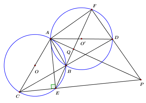 Cho hai đường tròn bằng nhau \(\left( {O;\,\,R} \right)\) và \(\left( {O’;\,\,R} \right)\) cắt nhau tại hai điểm \(A\) và \(B\) sao cho \(AB = R.\) Kẻ đường kính \(AC\) của đường tròn \(\left( O \right).\) Gọi \(E\) là một điểm bất kỳ trên cung nhỏ \(BC\,\,\left( {E \ne B,\,\,C} \right).\) \(CB\) và \(EB\) lần lượt cắt đường tròn \(\left( {O’} \right)\) tại các điểm thứ hai là \(D\) và \(F.\)