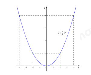 Vậy đồ thị hàm số \(y = \dfrac{1}{2}{x^2}\) là đường cong đi qua các điểm \(\left( { – 4;\,\,8} \right),\,\,\left( { – 2;\,\,2} \right),\,\,\left( {0;\,\,0} \right),\,\,\left( {2;\,\,2} \right),\,\,\left( {4;\,\,8} \right)\) và nhận trục \(Oy\) làm trục đối xứng.