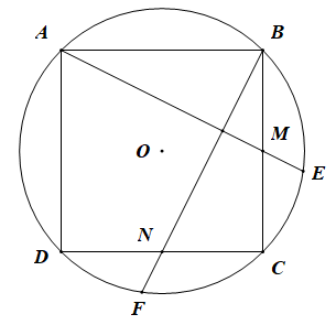 Câu 10. Cho hình vuông ABCD nội tiếp đường tròn tâm O. Gọi M, N lần lượt là trung điểm BC, CD. Đường thẳng AM, BN cắt đường tròn lần lượt tại E, F (như hình vẽ bên).