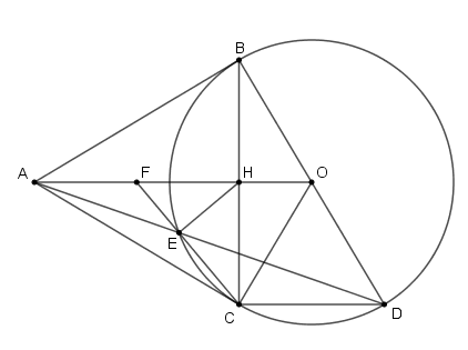 Cho đường tròn \(\left( {O;R} \right)\) và \(A\) là một điểm nằm bên ngoài đường tròn. Từ điểm A kẻ hai tiếp tuyến \(AB\) và \(AC\) với đường tròn \(\left( O \right)\) ( B và C là hai tiếp điểm). Gọi \(H\) là giao điểm của \(AO\) và \(BC\). Kẻ đường kính \(BD\) của đường tròn \(\left( O \right)\), \(AD\) cắt đường tròn tại điểm thứ hai là \(E\).
