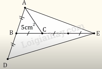 Cho tam giác ABC có diện tích là 5 cm2. Kéo dài AB ra một đoạn sao cho AB = BD. Kéo dài BC ra một đoạn sao cho cho BC = $\frac{1}{2}$ CE. Tính diện tích tam giác ADE.