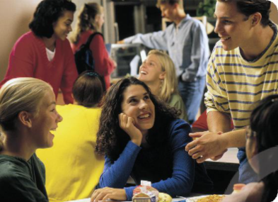 (Những người này đang ở căn tin. Họ đang dùng bữa và nói chuyện với bạn của họ.)