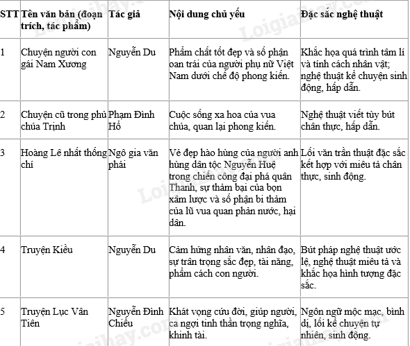 Truyện trung đại đã được học ở các bài: 4, 5, 6, 7, 8 và 9. Ghi những kiến thức cần ghi nhớ vào cột thích hợp: