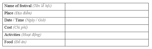 (Bây giờ, hãy tưởng tượng bạn là thành viên của ban văn hóa của một thị trấn nhỏ trong nước và đang lên kế hoạch cho một lễ hội truyền thống. Chọn một lễ hội và hoàn thành bảng.)