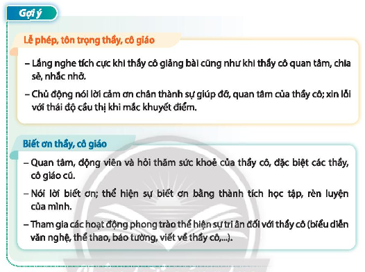 Thực hiện lời nói, hành vi ứng xử lễ phép, tôn trọng, biết ơn thầy cô trong học tập, hoạt động ở lớp, ở trường và chia sẻ kết quả đạt được với thầy cô, bạn bè.