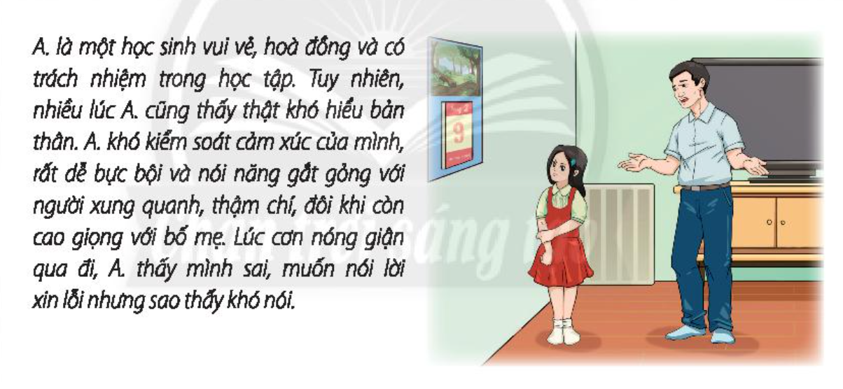 A gặp vấn đề khó kiểm soát được cảm xúc của mình, rất dễ bực bội và nói năng gắt gỏng với người xung quanh. Theo em A nên kiềm chế cảm xúc và cơn nóng giận của mình lại bằng cách hít thở đều khi nóng giận, chia sẻ tâm sự với mọi người những khó khăn của mình.