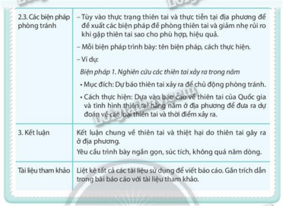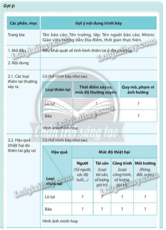 Phương pháp giải: Dựa vào gợi ý, tìm hiểu và tự viết một bài báo cáo về tình hình thiên tai và thiệt hại do thiên tai ở địa phương.