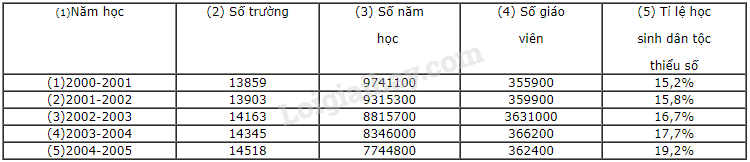 Dựa vào các số liệu đã cho (Tiếng Việt 5, tập hai, trang 163 – 164), em hãy lập bảng thống kê về tình hình phát triển giáo dục tiểu học của nước ta từ năm học 2000 – 2001 đến năm học 2004 – 2005.