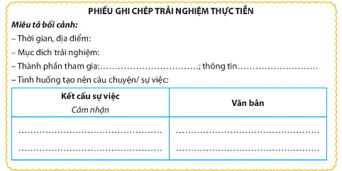 Bạn hãy dùng mẫu phiếu ghi chép trải nghiệm sau đây để ghi chép lại một sự kiện văn hóa mà bạn trực tiếp tham gia. Có thể dùng các phương tiện ghi âm hay ghi hình để sau đó chép lại thành văn bản, những suy nghĩ và cảm xúc bạn nên ghi tại chỗ xảy ra sự kiện.