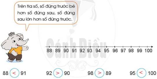 +) Số 95 đứng trước số 100, do đó 95 < 100.