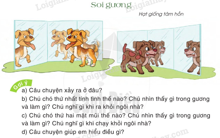 3. Một chú chó khác mặt mũi cau có, ủ rũ cũng đi vào ngôi nhà bán gương. Khi nhìn thấy có bao nhiêu con chó mặt mày cau có, xấu xí đang nhìn mình, chó ta sủa ầm lên, những con chó kia cũng sủa ầm lên. Con chó sợ quá, hốt hoảng chạy ra ngoài. Nó nghĩ: “Nơi này thật khủng khiếp. Ta sẽ không bao giờ đến đây nữa!”.