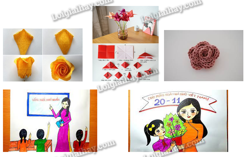 HS tự làm bưu thiếp/thiệp như trên hoặc món quà nhỏ tự tay làm (gấp hoa hồng bằng giấy, đan len thành bông hoa, móc chìa khóa, vẽ tranh chân dung thầy cô…)