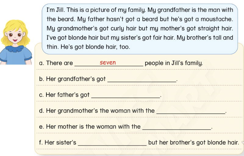 Tôi là Jill. Đây là một bức ảnh của gia đình tôi. Ông tôi là người đàn ông có râu. Bố tôi không có râu nhưng ông ấy có ria mép. Bà tôi có mái tóc xoăn nhưng mẹ tôi có mái tóc thẳng. Tôi có mái tóc vàng nhưng em gái tôi có mái tóc hoe. Anh trai tôi cao và gầy. Anh ấy cũng có mái tóc vàng.