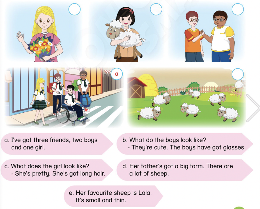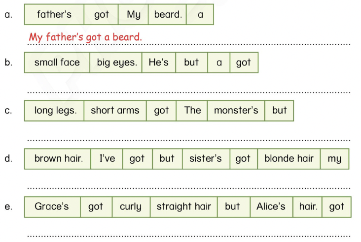 She is the girl with the brown hair. Alice’s got blonde hair. May’s got black hair. (Cô ấy là cô gái có mái tóc nâu. Alice có mái tóc vàng. May có mái tóc đen.)