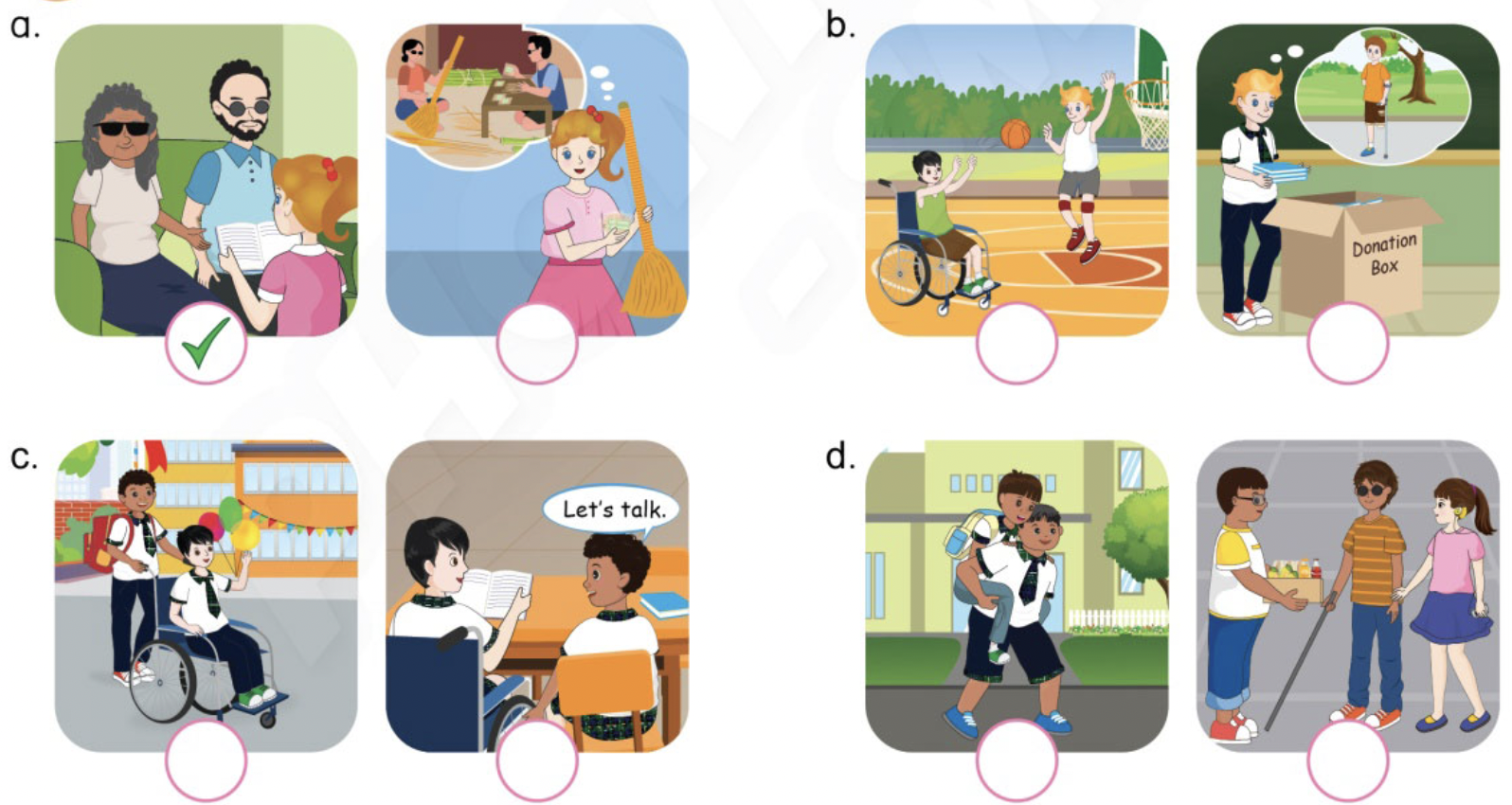 (Tôi đọc sách cho người khuyết tật. Tôi tặng đồ dùng học tập cho người khuyết tật.)