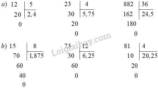 \( \dfrac{a}{b} = a : b\). Do đó để viết phân số \( \dfrac{a}{b}\) dưới dạng số thập phân ta thực hiện phép tính chia \( a : b\).