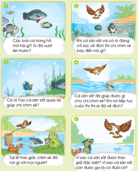 Các loài cá trong hồ mở hội thi bơi. Chẳng mấy chốc, cá săn sắt và cá rô đã vượt lên trước. Khi hai bạn đang cố hết sức về đích thì nghe thấy tiếng chị chim sẻ kêu thảm thiết :