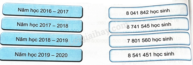 Nối mỗi năm học với số học sinh tiểu học của năm học đó (theo Niên giám thống kê năm 2017, 2018, 2019, 2020). Biết số học sinh tiểu học tăng dần qua từng năm học.