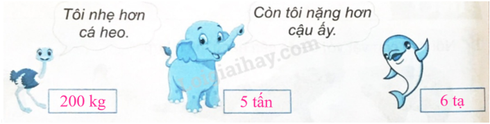 Biết đà điểu nhẹ hơn cá heo và voi nặng hơn cá heo nên cân nặng của đà điểu là 200 kg; cân nặng cá heo là 6 tạ; cân nặng voi là 5 tấn.