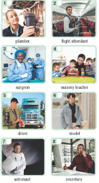 4. Listen and repeat. Match the jobs (1–8) to the job descriptions (a–h) and make sentences as in the example.