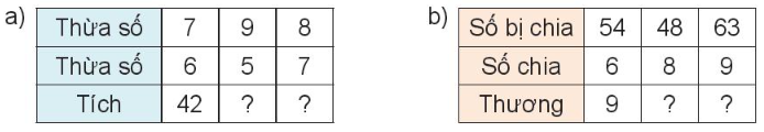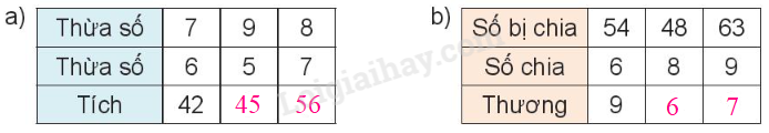 Quan sát bảng nhân, bảng chia ở câu a để tìm kết quả mỗi phép tính.