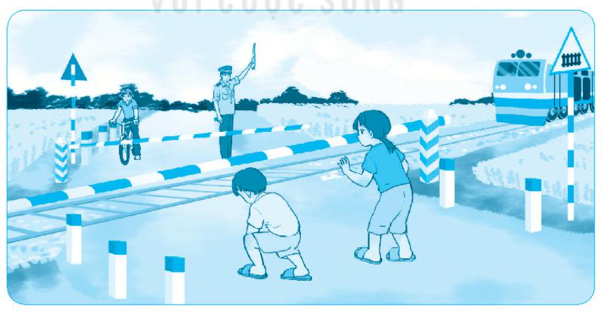 – Tình huống: một bạn nam đang định chui qua rào chắn đường ray, trong khi đó, tàu chuẩn bị đi tới.