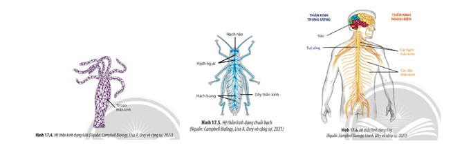 Quan sát Hình 17.4, 17.5 và 17.6 hãy lập bảng phân biệt các dạng hệ thần kinh ở động vật.