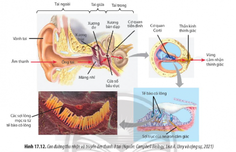 Quan sát Hình 17.12, hãy trình bày con đường thu nhận và truyền tín hiệu âm thanh ở tai. Nếu màng nhĩ bị tổn thương sẽ ảnh hưởng như thế nào đến sự thu nhận và truyền âm thanh ở tai