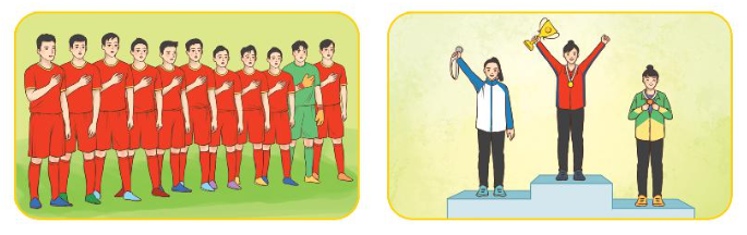 Tranh 1: Các cầu thủ đang chuẩn bị ra sân đá bóng và đang đặt tay lên ngực trái để hát Quốc ca. Em cảm thấy yêu và tự hào nền thể thao bóng đá nước nhà.