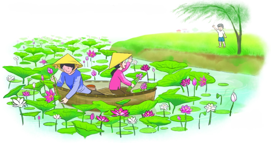 Mẹ con bác Tâm bơi mủng đi hái sen. Bác cẩn thận ngắt từng bông, bó thành từng bó, bọc bên ngoài một chiếc lá, rồi để nhè nhẹ vào lòng thuyền.