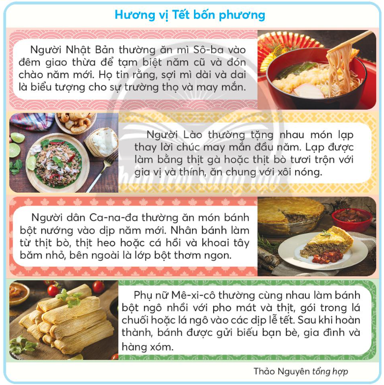 Giới thiệu với bạn một món ăn ngày Tết ở quê em theo gợi ý. Đọc và trả lời câu hỏi. Vì sao người Nhật Bản thường ăn mì Sô-ba vào đêm giao thừa. Đầu năm, người Lào tặng nhau món lạp thay cho điều gì. Nhân bánh bột nướng của người Ca-nda-đa được làm từ những nguyên liệu gì. Trong các dịp lễ tết, phụ nữ Mê-xi-cô thường cùng nhau làm gì. Bài đọc giúp em biết thêm điều gì. Nói về một món bánh quen thuộc của Việt Nam mà em biết.