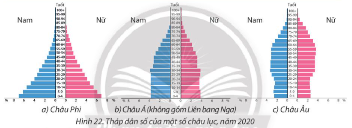 Dựa vào hình 22 và kiến thức đã học, em hãy so sánh tháp dân số của châu Phi, châu Á, châu Âu về cơ cấu dân số theo tuổi, cơ cấu dân số theo giới tính.