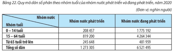 Cơ cấu dân số theo nhóm tuổi của nhóm nước phát triển và đang phát triển năm 2020 có sự khác nhau: