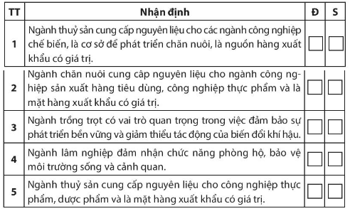 Những nhận định sau đây về vai trò của ngành nông nghiệp, lâm nghiệp, thủy sản là đúng (Đ) hay sai (S)? Hãy đánh dấu (X) vào các ô tương ứng bên cạnh mỗi nhận định