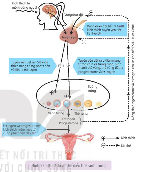– Ở quá trình sinh trứng: nồng độ progesterone và estrogen trong máu tăng lên sẽ gây ức chế lên vùng dưới đồi và tuyến yên, làm giảm GnRH, FSH và LH