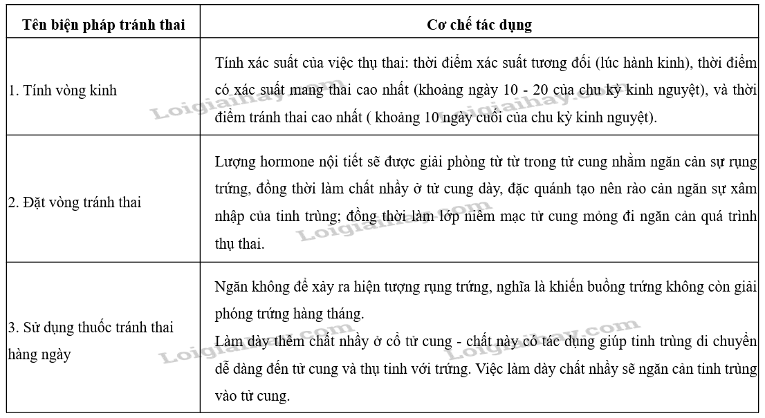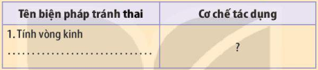 CH 2: Tìm hiểu qua tài liệu, internet, hỏi bác sĩ, cán bộ y tế,… về tên và cơ chế tác dụng của các biện pháp tránh thai, sau đó kẻ bảng vào vở và hoàn thành bảng theo mẫu dưới đây: