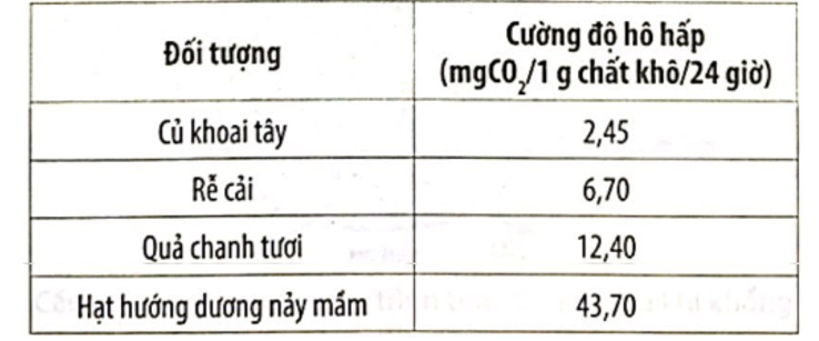 Cường độ hô hấp ở một số đối tượng thực vật được trình bày trong bảng sau: