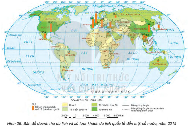 Đọc lại kiến thức về tình hình phân bố ngành du lịch thế giới và quan sát bản đồ hình 36 để xác định
