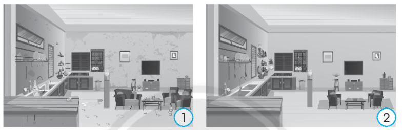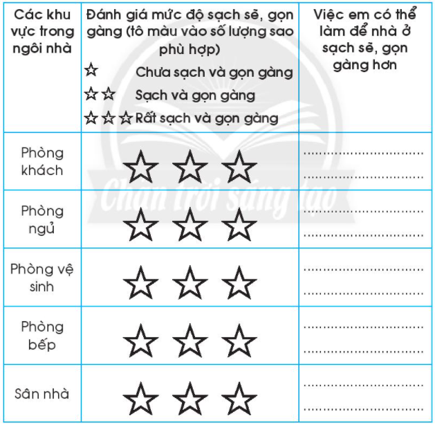Quan sát hai hình sau và viết vào chỗ (…) câu trả lời của em. Đánh dấu tích vào ô trống ở hình chỉ những việc làm đúng giúp giữ sạch nhà ở. Điền số từ 1 đến 5 vào ô trống tương ứng với thứ tự các bước lau sàn nhà sạch và an toàn. Quan sát thật kĩ ngôi nhà em đang ở và hoàn thành phiếu sau.