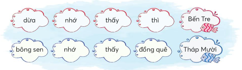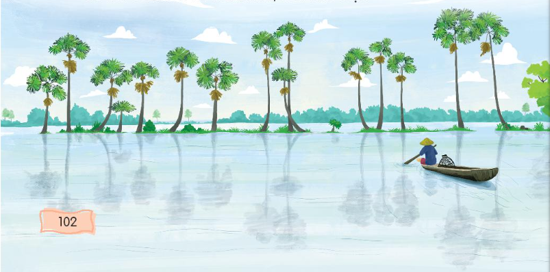 Trao đổi với bạn về những điều em thấy trong ảnh dưới đây. Đọc và trả lời câu hỏi. Mùa nước nổi bắt đầu vào thời điểm nào. Những hình ảnh nào báo hiệu mùa nước nổi đã về. Mỗi sự vật dưới đây được tả bằng những từ ngữ nào. Hình ảnh mặt nước có gì đẹp. Mùa nước nổi qua đi để lại những gì cho những vụ mùa sau. Sắp xếp các từ ngữ sau thành câu ca dao. Nói 1 – 2 câu về câu ca dao đã sắp xếp được ở bài tập 2.