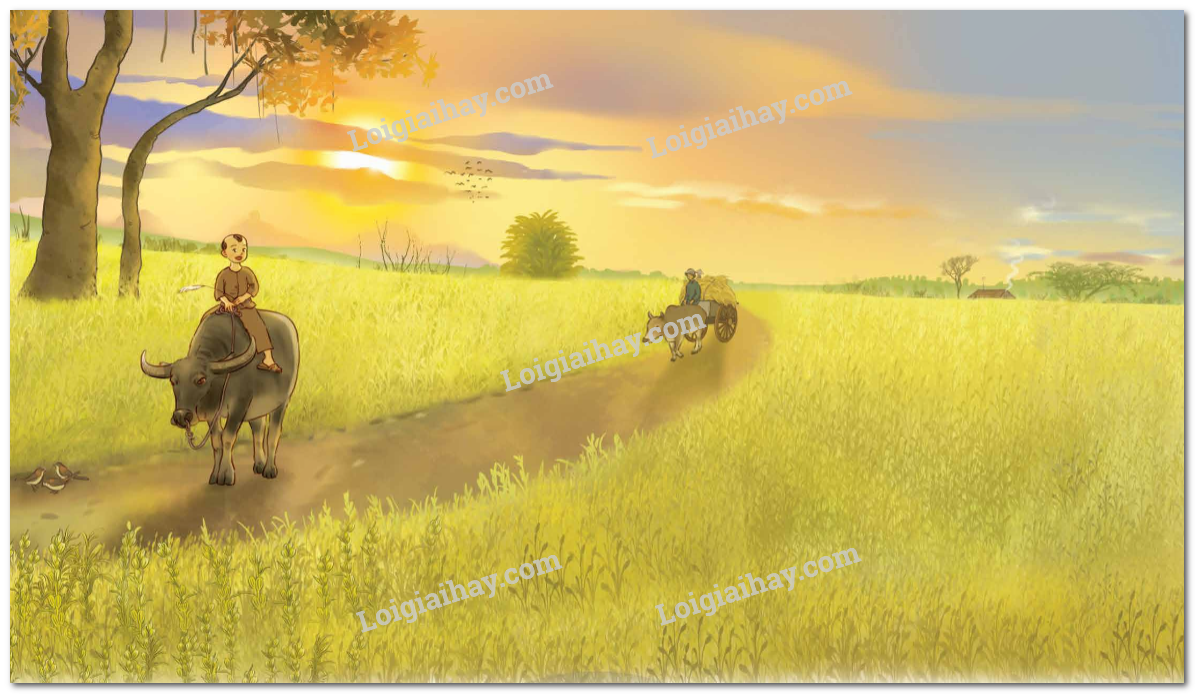 – Chiều về, dọc những con đường nhỏ như dải lụa đỏ quanh co vắt ngang cánh đồng, những chiếc xe bò chất đầy những bó vừng vàng tươi đang túc tắc về làng