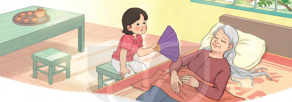 b. Bạn nhỏ quạt cho bà trong lúc bà ngủ.