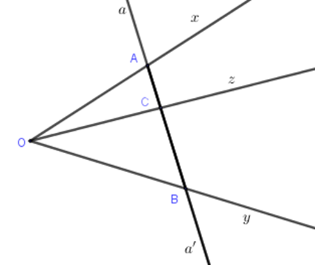 + Vẽ đường thẳng \(aa’\) cắt hai tia \(Ox;\,Oy\) theo thứ tự tại \(A\) và \(B\)(khác \(O\))