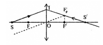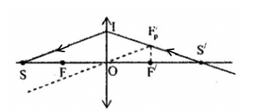 + Tia tới song song với trục phụ thì tia ló qua tiêu điểm phụ nên tia ló qua \(I\) và \({F_p}’\), tia ló này cắt trục chính tại \(S’\). \(S’\) là ảnh cần xác định.